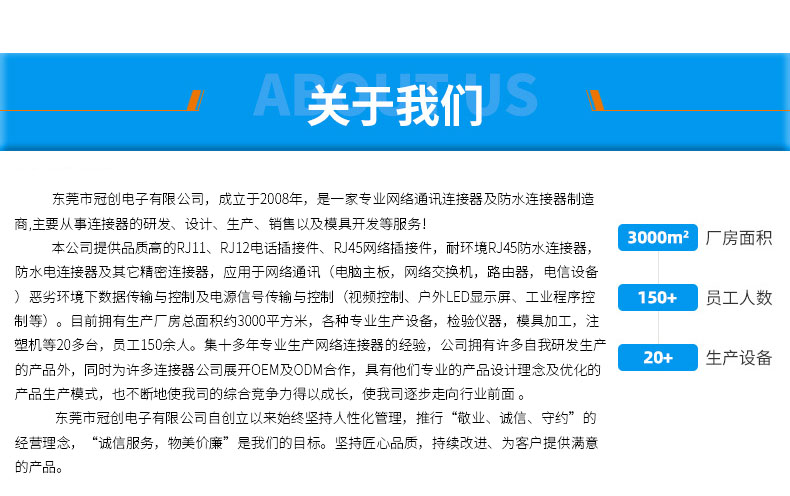 本公司提供優良的RJ11、RJ12電話插接件、RJ45網絡插接件,耐環境RJ45防水連接器,防水電連接器及其它精密連接器,產品應用于網絡通訊(電腦主板,網絡交換機,路由器,電信設備)、惡劣環境下數據傳輸與控制及電源信號傳輸與控制(戶外LED顯示屏、機器控制、工業程序控制等)